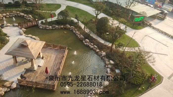 地面材料忌用大块光面,水景为追求镜面效果多采用高抛光光面,主材宜用荔枝面或者火烧面,立面材料宜用荔枝面以减少色差,且最好用专业石胶粘贴,以控制返碱;